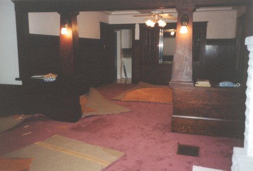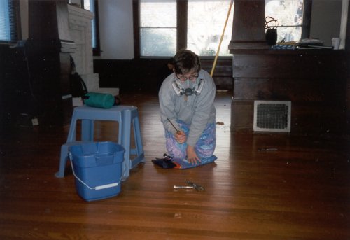 | Previous Owner Living Room | Ripping Up The Old Carpet | Ellen Pulling Tacks | Refinished Floors |